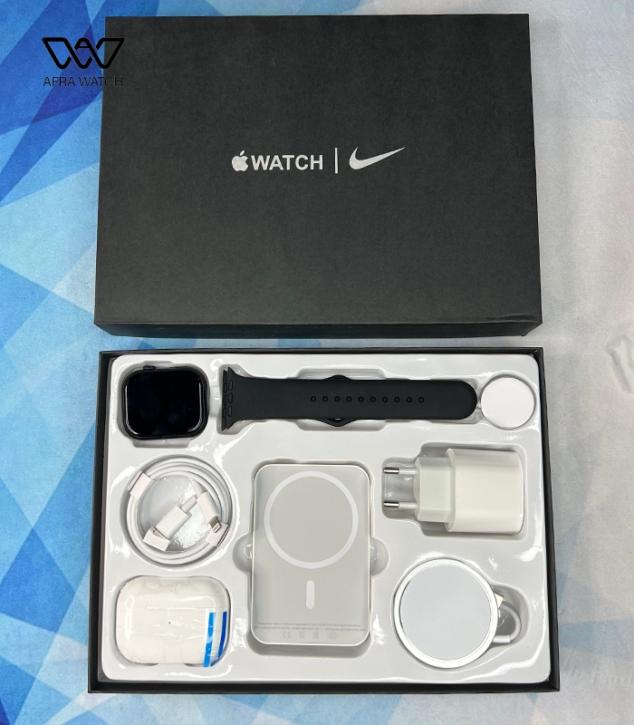 پک خاص نایکی شامل شارژر مگسیف آیفون، شارژر وایرلس ایرپاد پرو، پایه شارژ مغناطیسی ساعت، کلگی شارژ سریع، کابل Type‑C به Lightning و هندزفری طرح ایرپاد پرو میباشد. این ساعت در رنگهای مشکی و نقرهای عرضه شده و انتخابی شیک برای آقایان و بانوان محسوب میشود.