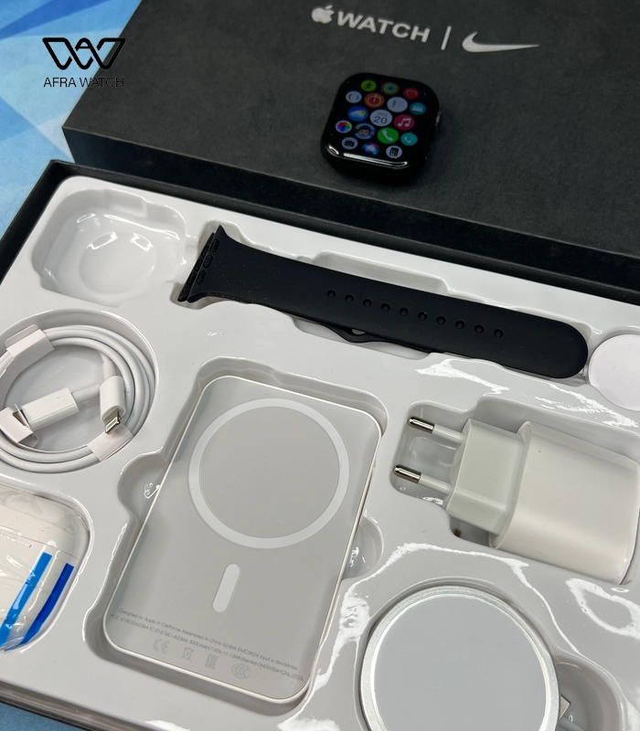 پک خاص نایکی شامل شارژر مگسیف آیفون، شارژر وایرلس ایرپاد پرو، پایه شارژ مغناطیسی ساعت، کلگی شارژ سریع، کابل Type‑C به Lightning و هندزفری طرح ایرپاد پرو میباشد. این ساعت در رنگهای مشکی و نقرهای عرضه شده و انتخابی شیک برای آقایان و بانوان محسوب میشود.