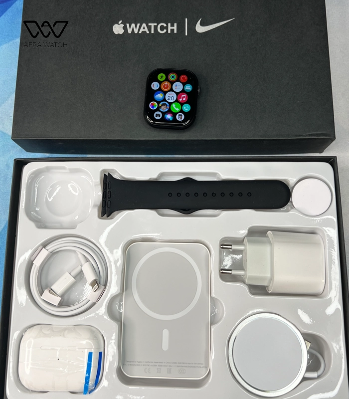 نکتهای که ارزش خرید APPLE LOGO NIKE Series11 را دوچندان میکند، پک کامل نایکی شامل شارژر مگسیف آیفون، شارژر وایرلس ایرپاد پرو، پایه شارژ مغناطیسی، کابل Type‑C به Lightning و هندزفری بلوتوث طرح ایرپاد پرو است. همه اینها در کنار هم، این ساعت را به یک انتخاب هوشمندانه، شیک و مقرونبهصرفه تبدیل کردهاند